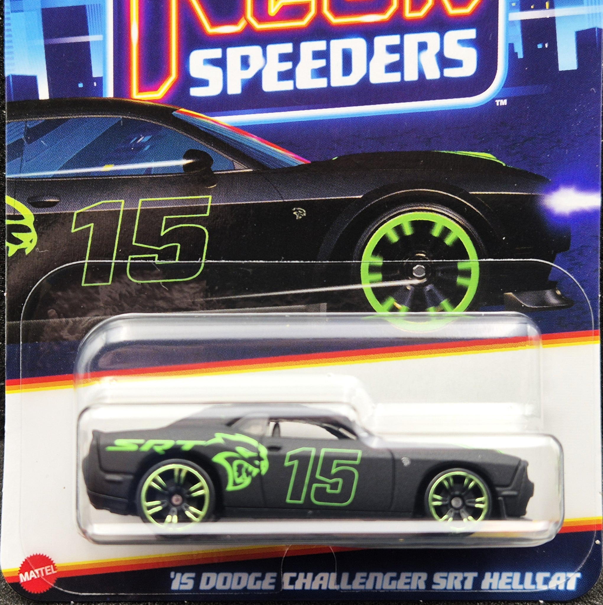 HOT WHEELS DIE CAST CAR - 2024 '15 Dodge Challenger SRT Hellcat Matte Black Neon Speeders 6/8 New Long Card