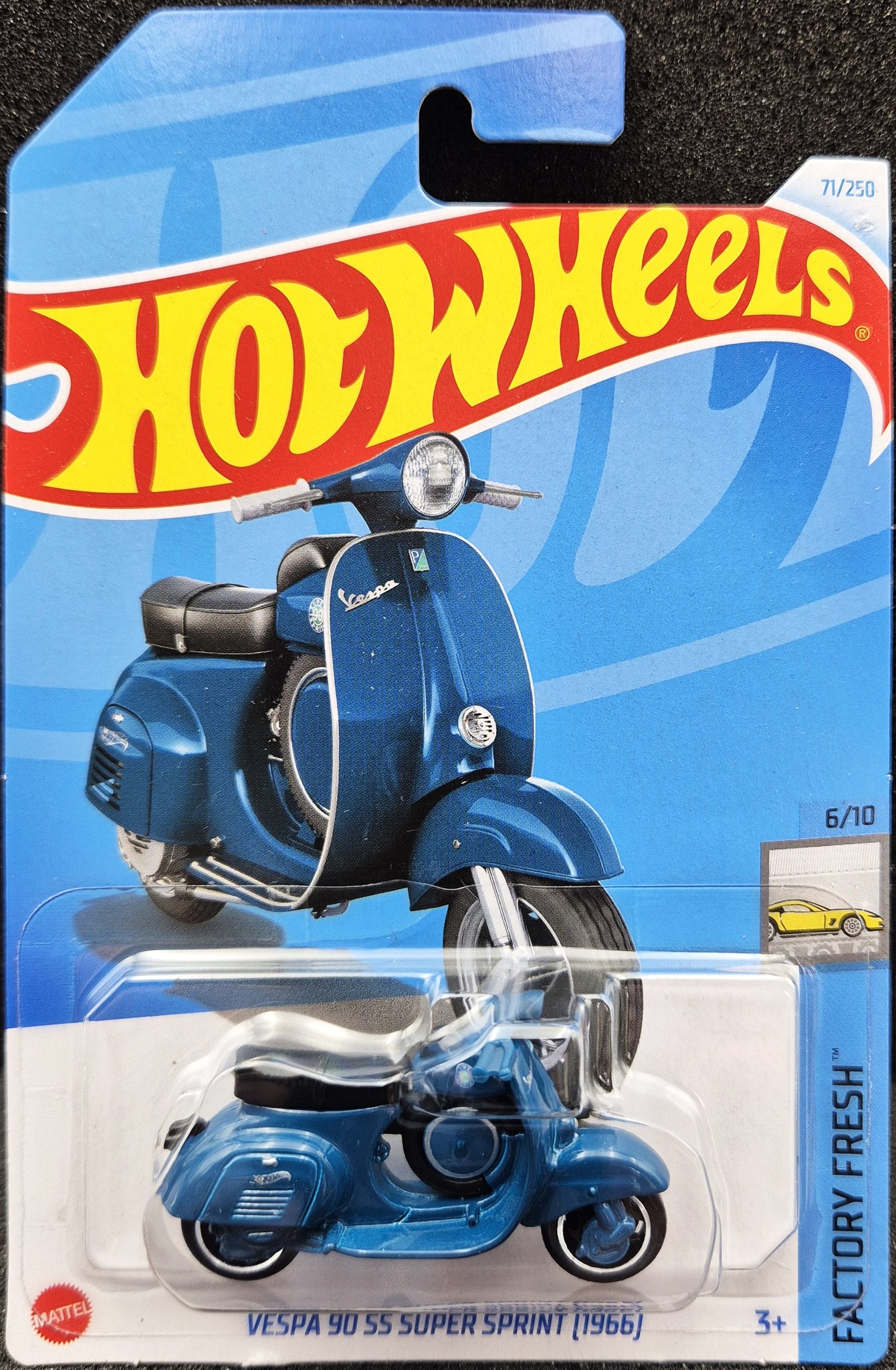 HOT WHEELS DIE CAST CAR - 2024 Vespa 90 SS Super Sprint (1966) Blue #71 Factory Fresh 6/10 New Long Card