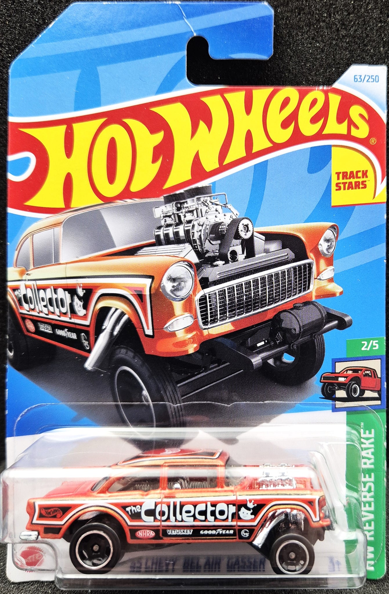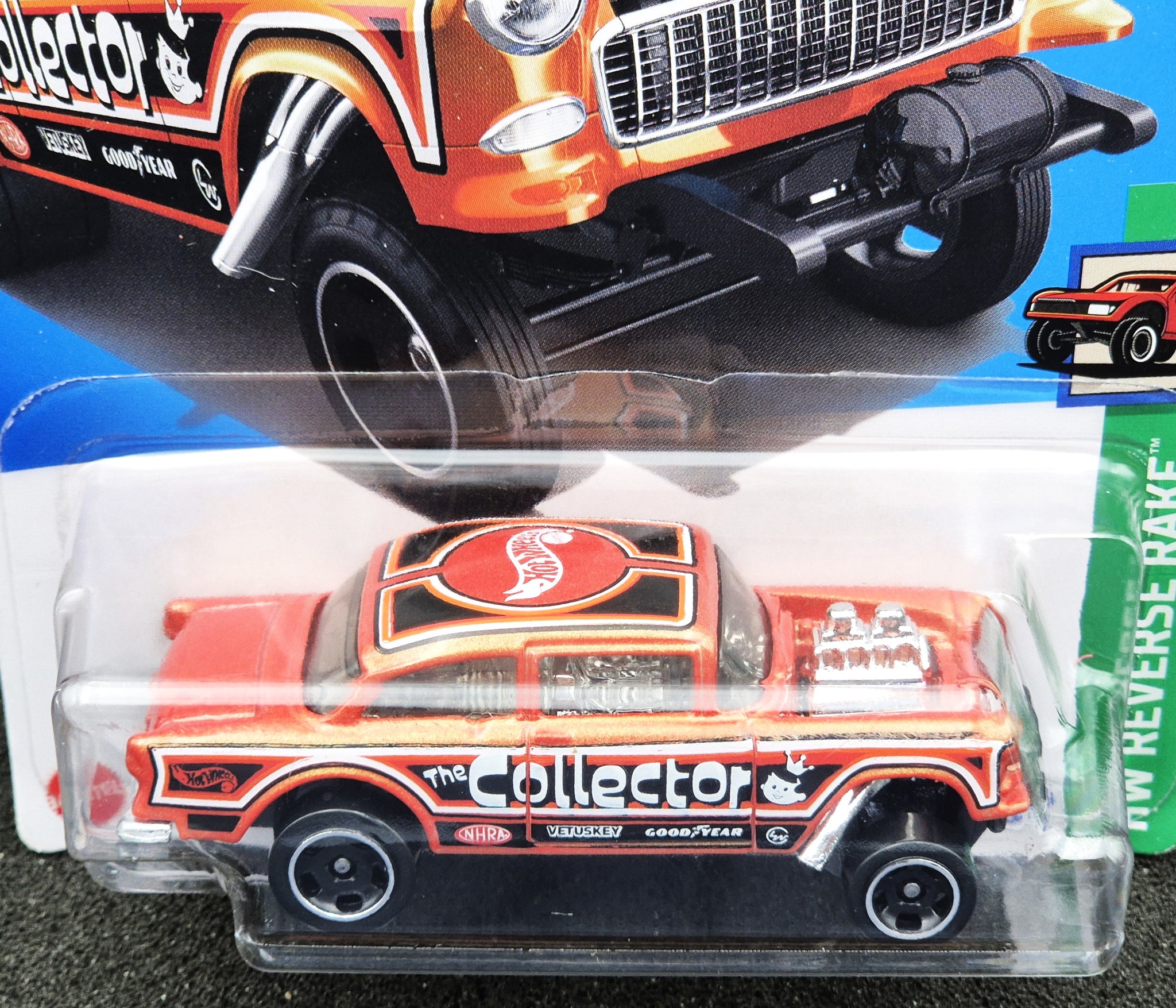 HOT WHEELS DIE CAST CAR - 2024 '55 Chevy Bel Air Gasser Orange #63 HW Reverse Rake 2/5 New Long Card