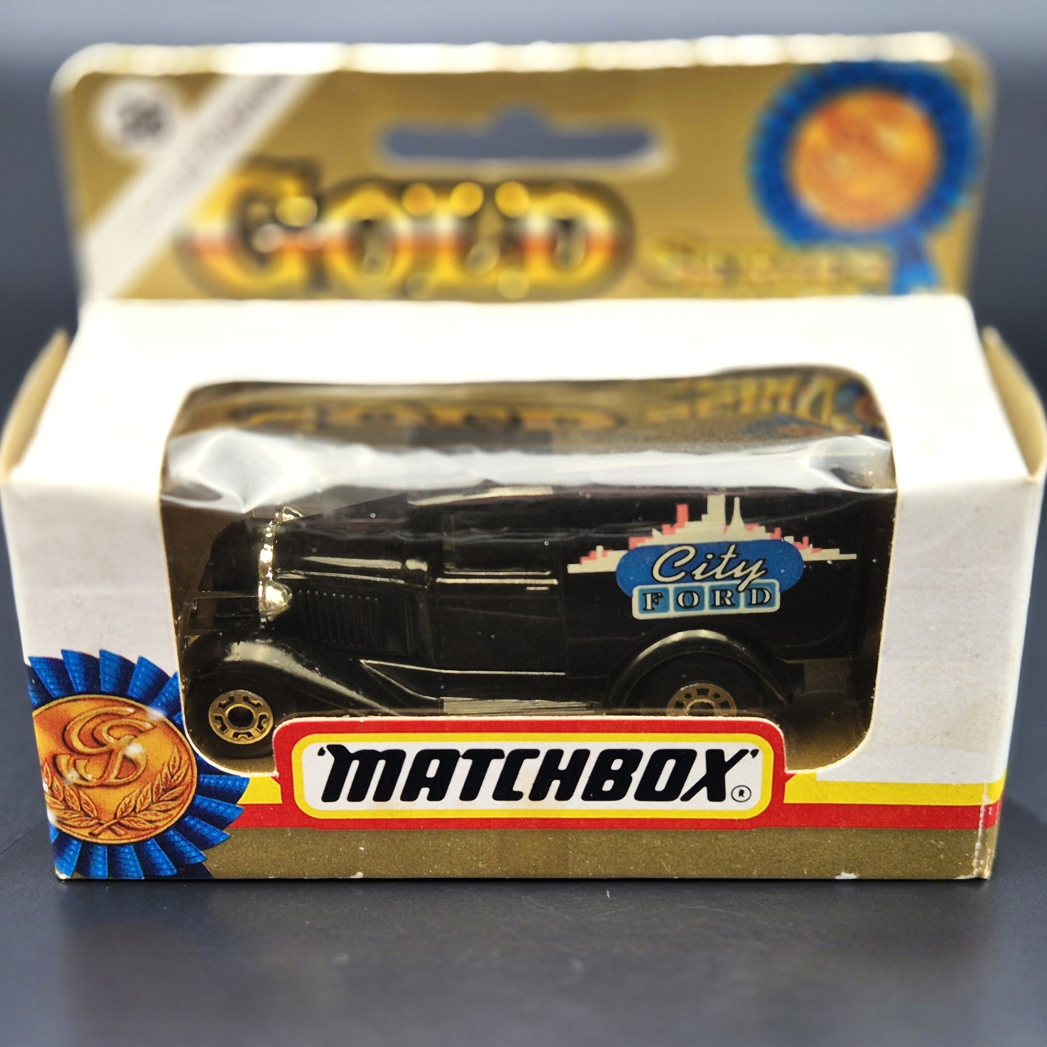 MATCHBOX DIE CAST CAR - 1993 Ford Model A Van City Ford Black 1-75 Gold Series MB38 Boxed
